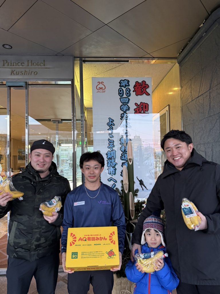 2026年1月2日 / 最終更新日時 : 2026年1月11日 ham179 お知らせ インカレ間近 OB激励 1月5日(月)から第98回日本学生氷上競技選手権大会(インカレ)が釧路市柳町スピードスケート場で開幕します。 1月2日(金)、インカレ開幕を前に沼崎高行先輩(2010年卒)が釧路市で事前合宿している選手の激励に訪れました。沼崎先輩からインカレに向けた心構えや激励のメッセージを聞き、選手たちの気持ちにも更なるギアが入ったかと思います。駿台氷愛会からもゼリー飲料の差入をさせて頂きました。 また、翌日の1月3日(土)には北澤慶記先輩(2015年卒)も激励に訪れ、学生に差し入れをして頂きました。選手たちは、ベストの滑りを目指して頑張って欲しいと思います。 沼崎先輩やOB会からの差入を受け取り、一層の気合が入った選手諸君 学生を前に話をする沼崎高行先輩 北澤先輩(右)からの差し入れを手にする津田主将(中央)と羽田監督(右) コメントを残す コメントをキャンセルメールアドレスが公開されることはありません。 ※ が付いている欄は必須項目ですコメント ※ 名前 ※ メール ※ サイト 次回のコメントで使用するためブラウザーに自分の名前、メールアドレス、サイトを保存する。 上に表示された文字を入力してください。 Δ